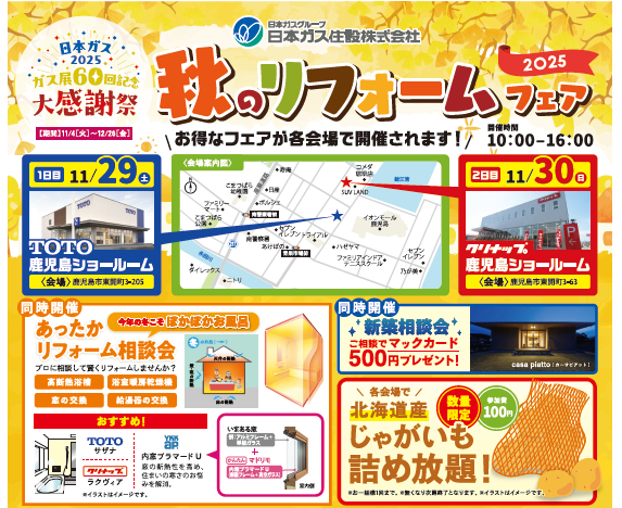 READ MORE キャンペーン・イベント 2025年11月4日 【秋のリフォームフェア2025】開催のお知らせ 日頃は弊社をはじめ、日本ガスグループをご愛顧いただき誠にありがとうございます。 第60回ガス展2025開催に伴い、下記の日程および会場で 「秋のリフォームフェア2025」を開催いたします! ■2025年11月29日(土) …