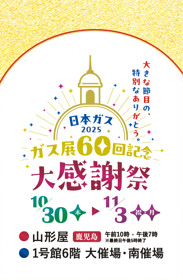 READ MORE キャンペーン・イベント 2025年10月6日 第60回ガス展セール開催のお知らせ 日頃は弊社をはじめ、日本ガスグループをご愛顧いただき誠にありがとうございます。 2025年10月30日(木)~11月3日(月祝)の期間に山形屋1号館6階にて『ガス展セール』を開催いたします! 開催60回を記念し、イモトア …